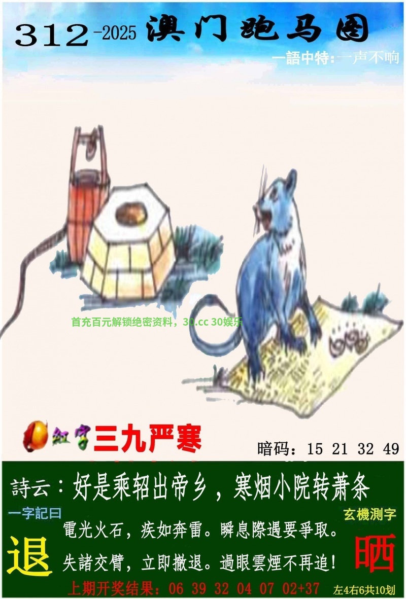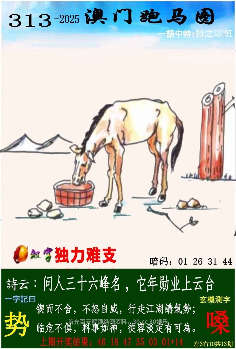 316期一字記曰:【渴】生命之源,不能缺莫,力爭一瓢求解渴;求生本能,一定準確,象床玉手出新奇。【瑞】