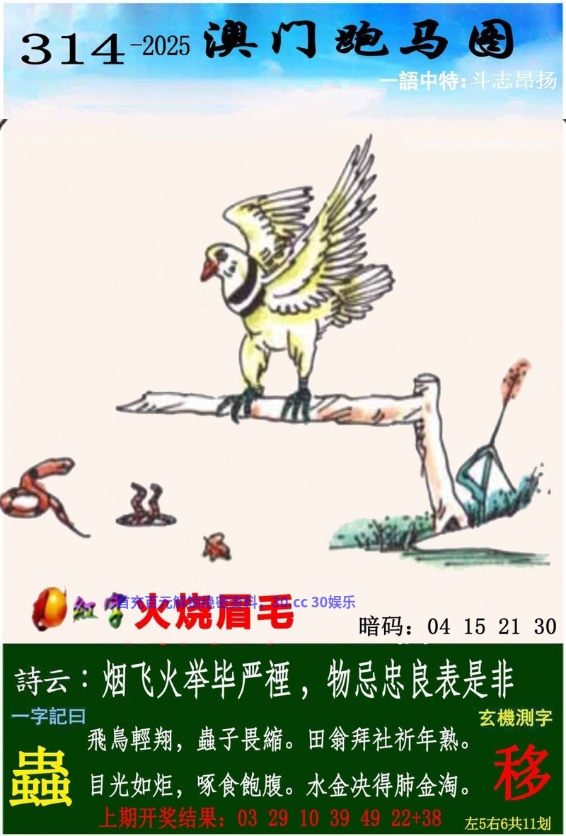 314期一字記曰:【蟲】飛鳥輕翔,蟲子畏縮。田翁拜社祈年熟。目光如炬,啄食飽腹。水金决得肺金淘。【移】